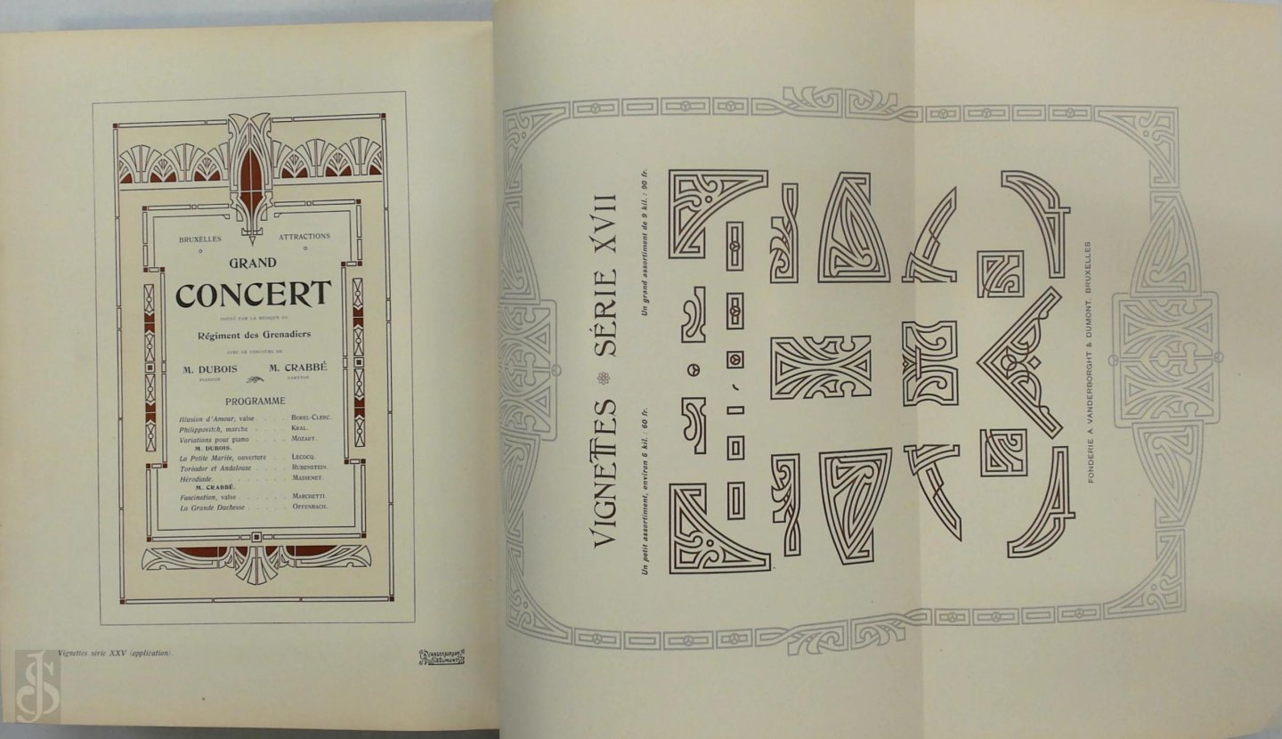 Specimen book which appeared after famous typographer Jean Dumont joined Fonderie Vanderborght in 1901 [subsequently the name was changed to A. Vanderborght & Dumont]; showcasing different types of ancient and modern fonts, Types Elzéviriens, Caractères de Genre, Écritures, Lettrines, Fantaisies, Fleurons and Vignettes + examples of applications.