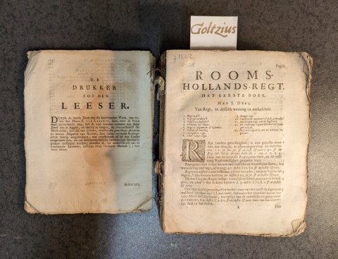 Het Rooms-Hollands-Regt Without titlepage, according to the note by the publisher it concerns an 11th edition, [Amsteldam (Amsterdam), D. Boom bookseller, 1744], 4to., without binding, sewn signatures on parchment strips, [44]+702+[26] pp., incomplete: in the front and the back of the bookblock pages are missing. There is no titlepage and the index ends abrubtly amidst the letter V. The book is considerably damaged with many folded corners in the front and back of the book block, the outer few pages are darkened and stained. A famous book on law. "Rooms-Hollands-Regt, waar in de Roomse wetten, met het huydendaagse Neerlands regt, in alles dat tot de dagelijkse onderhouding kan dienen, met een bysondre kortheit, so wel in de vaste Regts-stoffen, als in de manier van Regts-vordering over een gebragt werden" was first published in 1664, in Leiden and Rotterdam (Jacobus Hackens). Three reprints were published. A renewed and enlarged edition was published by a different publisher (Dirk Boom) in 1676, followed by 7 more editions. Even more reprints - in two volumes - followed (Jan ten Houten, Amsterdam). Lit: Dekkers p. 98; Roberts p. 184; N. de Bruijn, N. (2020).