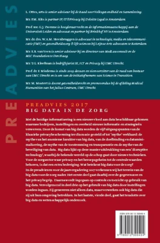 Met de huidige informatisering is een nieuwe vloed aan data beschikbaar gekomen waarmee bedrijven, instellingen en overheid nieuwe informatie en strategieën verwerven. Door de komst van big data worden de vijf uitgangspunten van de klassieke privacybescherming ter discussie gesteld of tot 'mythe' verklaard: de mythe van het anonieme karakter van big data, van de doelbinding en dataminimalisering, de mythe van de toestemming en transparantie en de mythe van de beveiliging van data. Big data lijkt op deze manier uitdrukking van een 'disruptive technology', waarbij de bekende wereld op de schop gaat door nieuwe technieken.Voor de zorgsector waar privacy en het beroepsgeheim tot de centrale waarden behoren, is dat een extra bedreiging. Wat betekent big data voor de zorg? In de preadviezen voor de jaarvergadering 2017 verkennen wij het terrein van de big data voor de zorg nader. Het eerste deel gaat daarbij over de gegevenszee en het privacybegrip. Daarna wordt ingegaan op controle en toezicht op gebruik vanbig data. Vervolgens zal in deel drie op het gebruik van big data door instellingen worden ingaan. Zij genereren niet alleen data, maar verwerken ook big data die zij uit hun omgeving betrekken. In het laatste, vierde deel, gaat het tenslotte over big data en wetenschappelijk onderzoek.