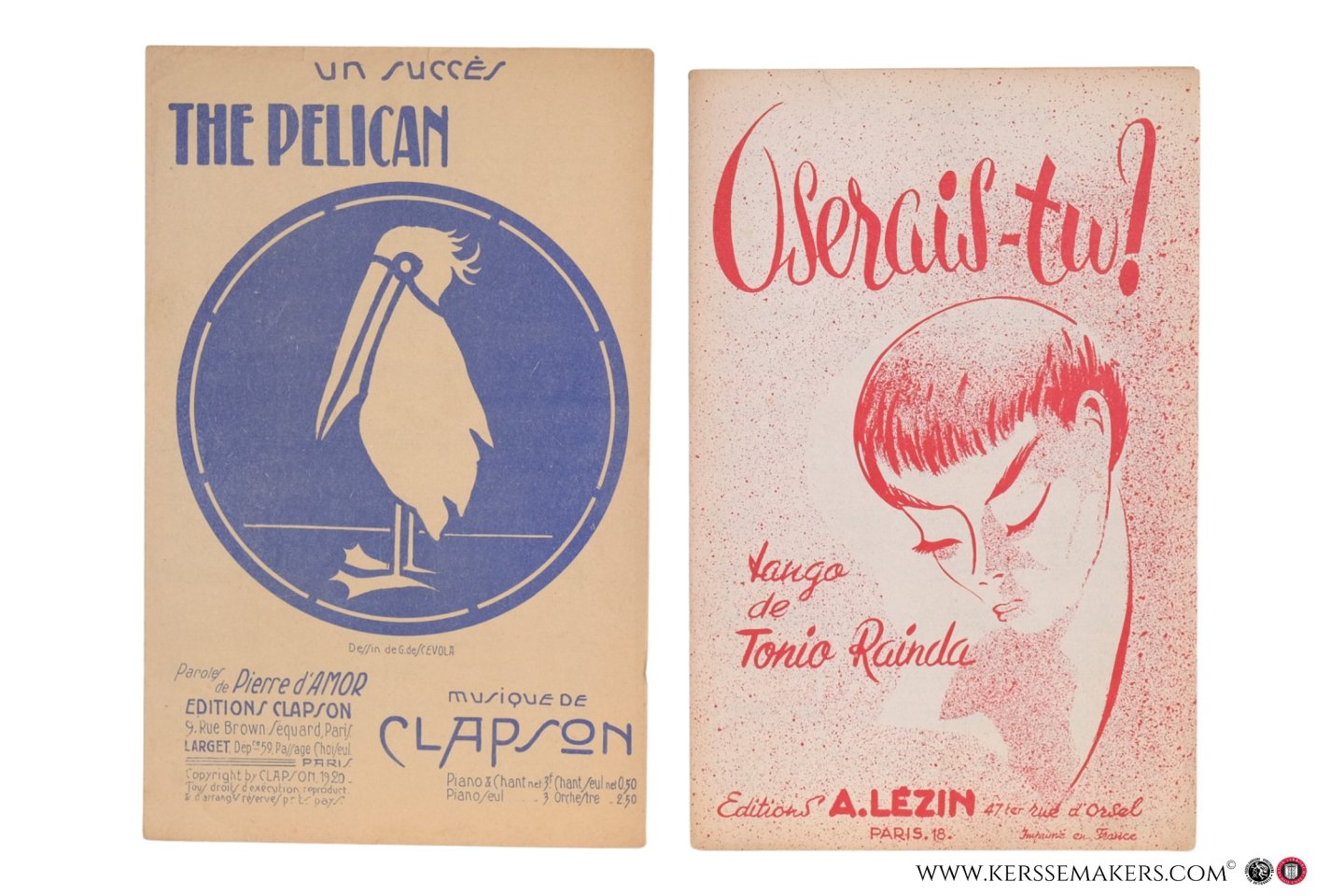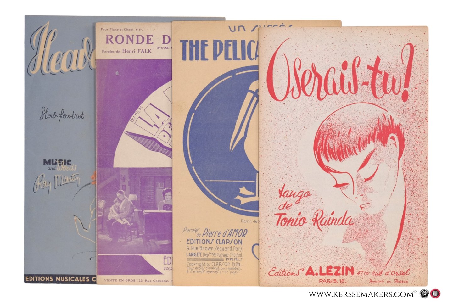 1)Martin. Bruxelles, Éditions musicales Ch. Bens, no date (1940?). 28x21 cm. Frontpage nicely illustrated in colour. - 2) Clapson. Paris, Éditions Clapson, 1920. (27,5x19 cm). Frontpage nicely illustrated after design by G. de Scevola, printed in blue. - 3) Paris, Éditions A. Lézin, 1955. (27 x 17,5cm). 10 pp.: 5 pp. annotated music, 3 pp. blank, 1 p. advertisement and 1 frontpage, illustrated, printed monochromatic. - 4) Bauge. Paris, Éditions Francis Salabert, 1930. (27,5x17,5 cm). Frontpage illustrated after design of H. Cerrutti, printed in violet.