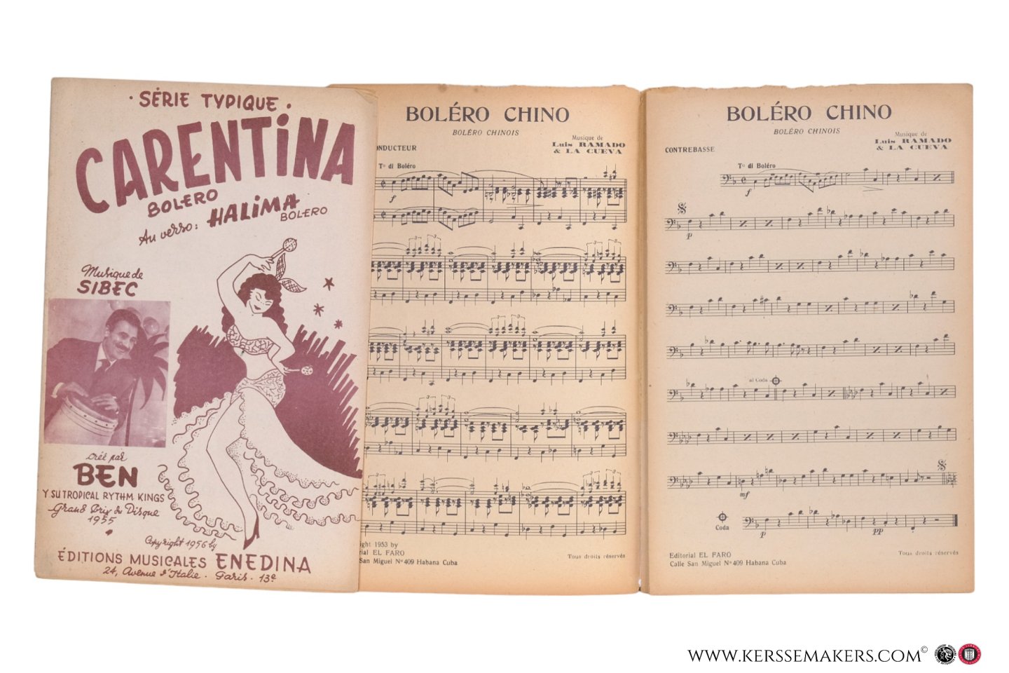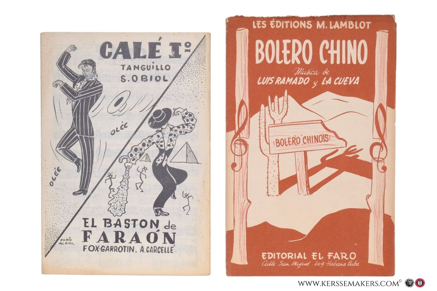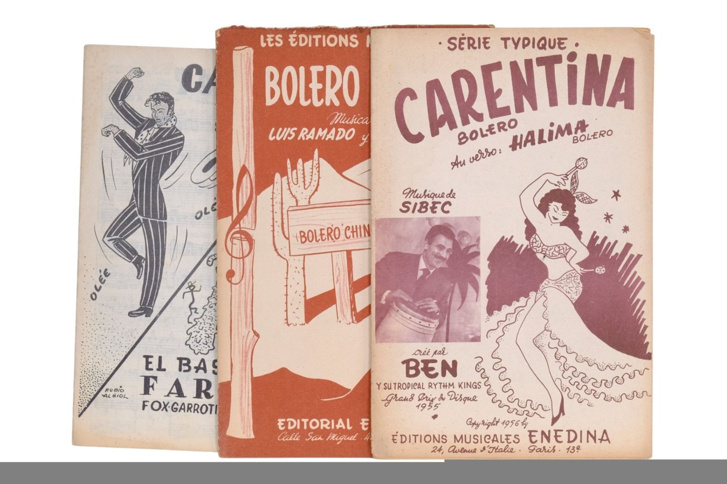 1) Obiol. Barcelona, A. Carcellé, no date. 16 pp.: 14 pp. annotated music, 1 p. advertisement & 1 frontpage illustrated, designed by Rubio Albiol. - 2) Ramado. Habana (Cuba), Editorial El Farao. (dépôt Les Éditions M. Lamblot), 1953. 12 pp.: 6 pp. annotated music, 4 pp. blank, 1 p. advertisement and 1 p.: Frontpage, illustrated monochromatic. (Some traces of use). - 3) Sibec. Paris, Éditions musicales Enedina, 1956. 14 pp.: 12 pp. annotated music and front- and back page illustrated, printed in brown.