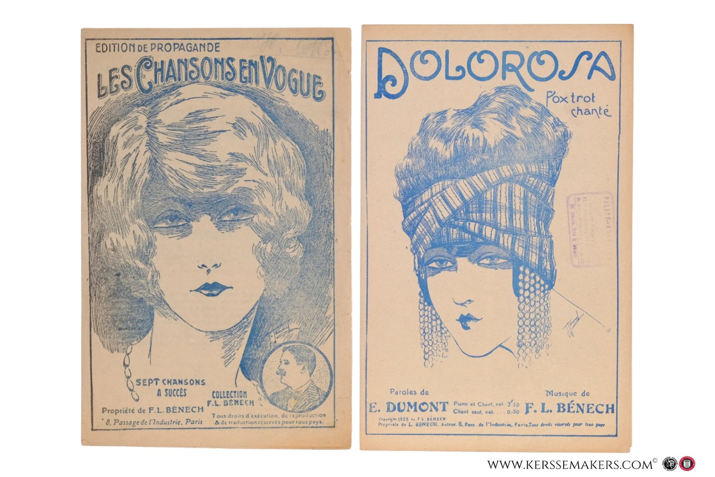 | Bijzonderheden: | 1913-1925, 4 musical scores (songs). Small size (27,5x17.5 cm.): 1) 4 pp. (2 p. annotated music), backcover advertisement, frontcover monochromatic design by Léon Pousthomis. |