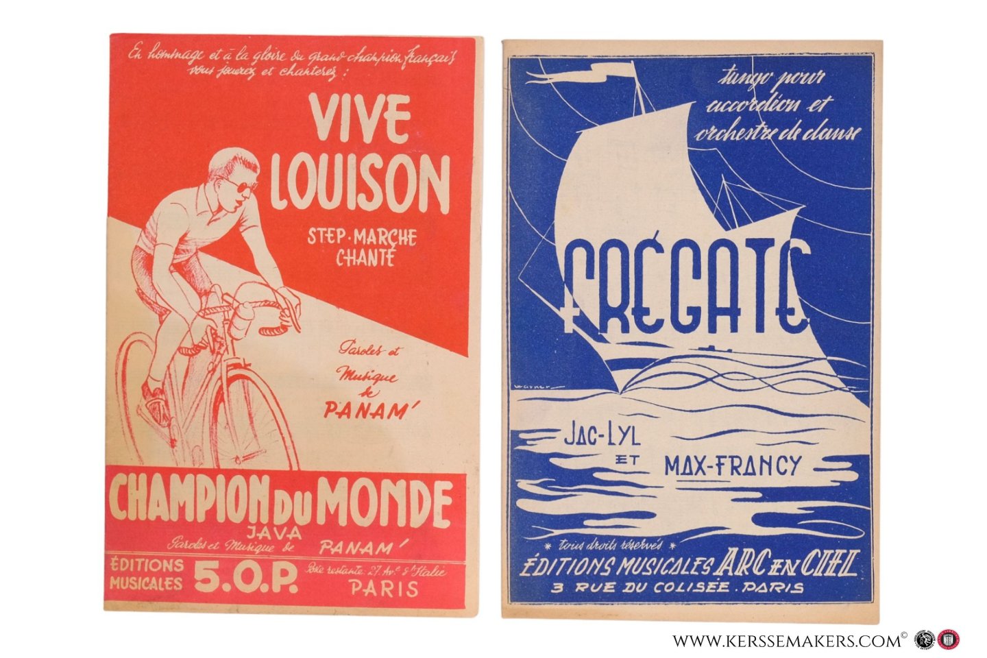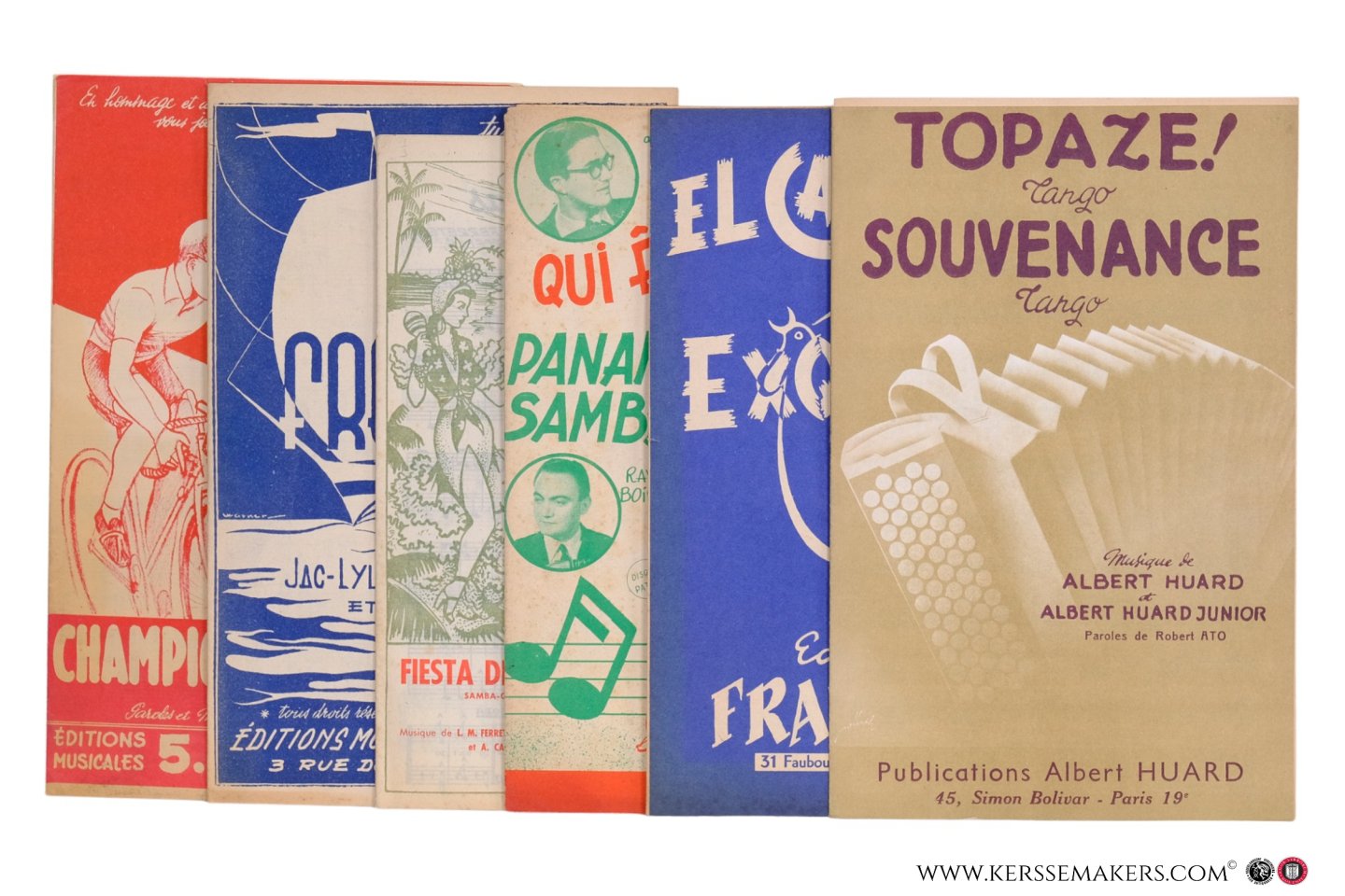 | Bijzonderheden: | c. 1955, 6 musical scores for accordeon and dance orchestra. Small size (26,5x17,5 cm). Each item 12 pp. - 1) Louison (Louis Bobet, coureur). 11 pages with annotated music and frontcover, printed in red, designed by (no signature). Paris, Édition... |