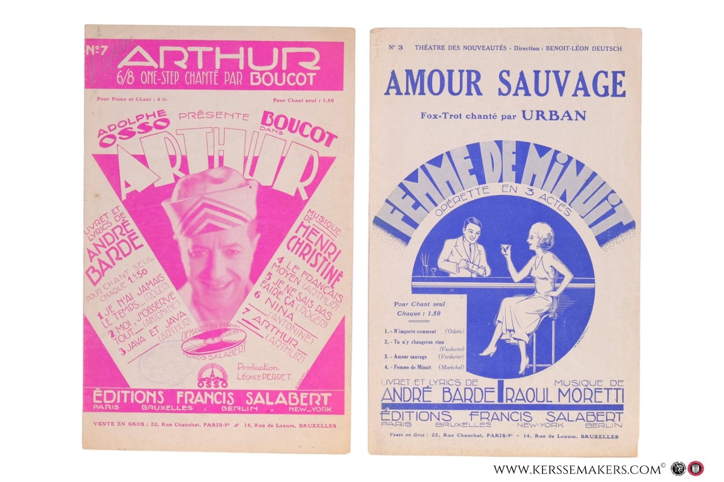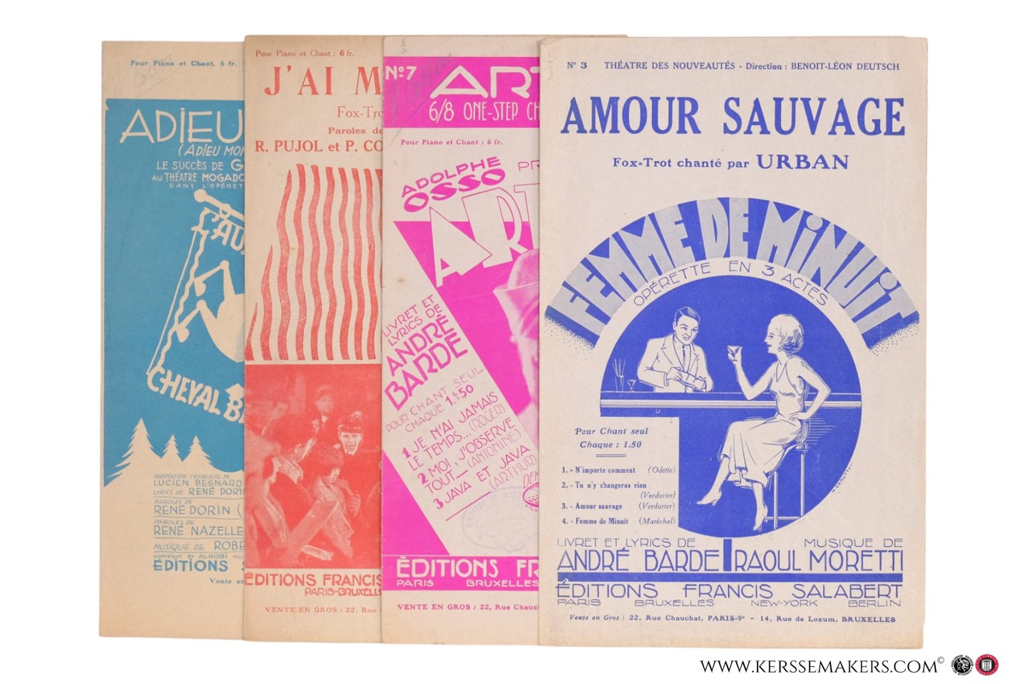 | Bijzonderheden: | 1930, 4 musical scores, small size (7,5x17,5 m). Each item 4 pages (2 pages annotated music). Frontcovers monochromatic designed by Cerutti. Backside covers with advertisement. |