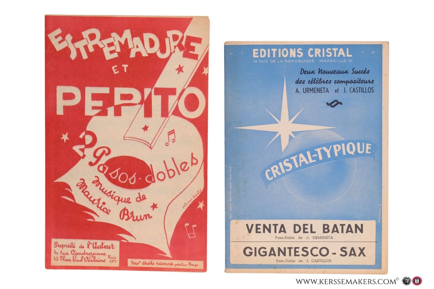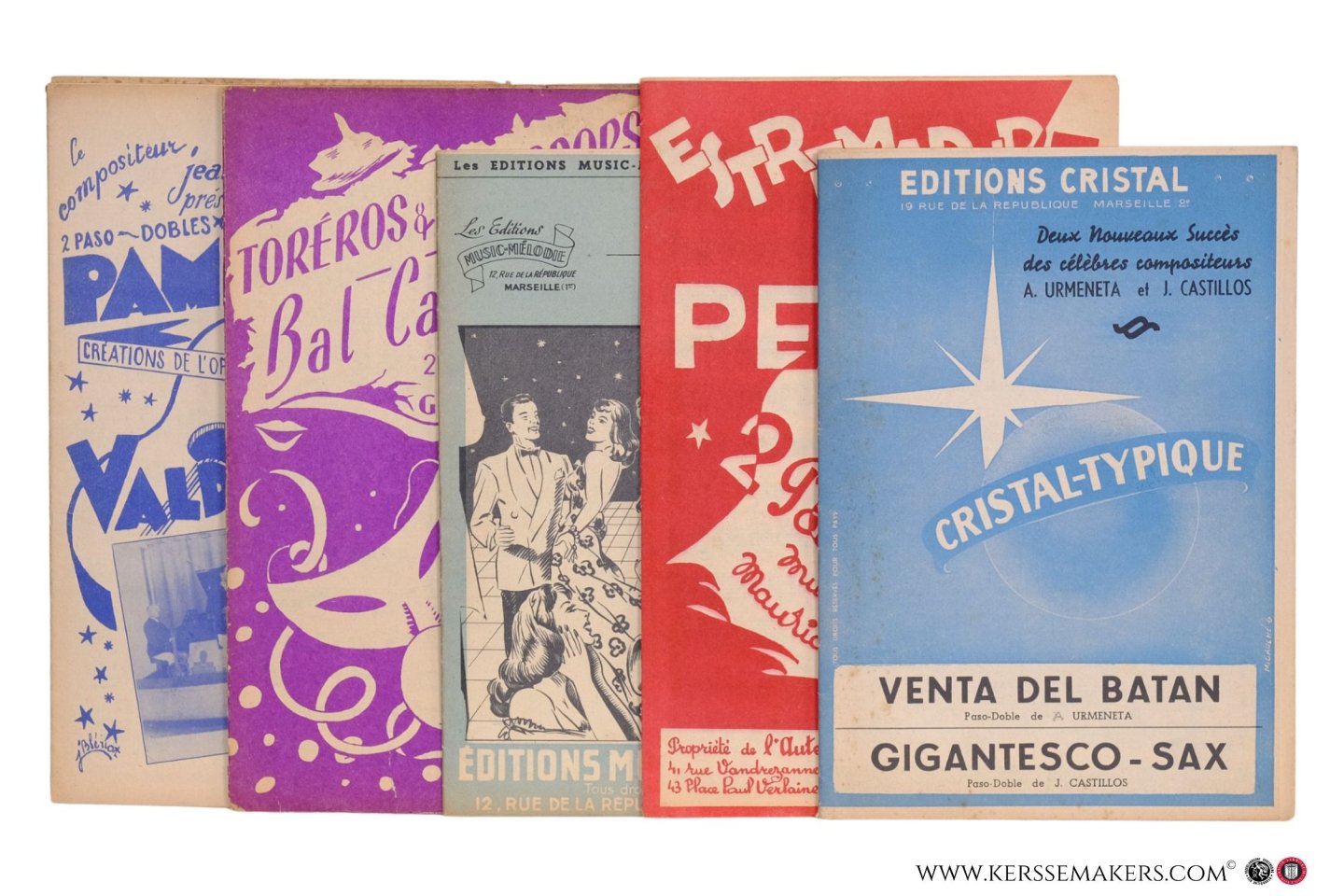 doble: 1) Marseille, J. Poujex, 1951. 18 pp. annotated music, frontcover illustrated, back cover 'Catalogue'. (lower margin of 4 leaves sl. dam.). Frontcover designed by J. Blériot. - 2) Paris, Publications Guy Simon, no date. 12 pages annotated music. Illustrated frontcover, last page with 'Extrait du catalogue'. - 3) Marseille, Éditions Music-Mélodie, 1952. 14 pp. annotated music. Frontcover illustrated frontcover, last page with 'Catalogue de nos orchestres'. - 4) Paris, Propriété de l'auteur, no date. 16 pp. annotated music (some marginal tears). Frontcover illustrated, designed by Michel Denis, backcover 'Catalogue'. 5) Marseille, Éditions Cristal, c. 1958. 20 pp. annotated music. Frontcover designed by M. Gauché. - Annotated music for different instruments 'saxo alto', 'trombon', 'accordéon', 'piano', etc.
