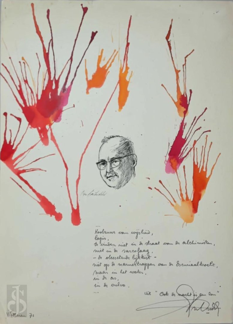 Albert Bontridder : lOrigineel handgeschreven gedicht '... Koolzuur van wijsheid...' uit 'Ook de nacht is een zon'\nMet portret en illustratie door Olga Dohnalova (zijn vrouw)\nGesigeerd door dichter en kunstenaar, gedateerd 'Wetteren 71'.\nBlad wat gekreukt aan de (boven)rand, punaise gaatjes in de twee bovenhoeken