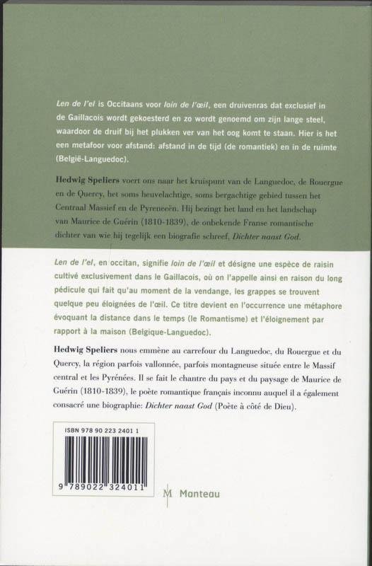 "In Len de l'el, de nieuwste dichtbundel van Hedwig Speliers, wordt opnieuw gereisd. In zijn Suites françaises bezocht hij diverse sites verspreid over heel Frankrijk. Ditmaal stuwt zijn Renault Scénic ons naar het kruispunt van de Languedoc, de Rouergue en de Quercy, het soms heuvelachtige, soms bergachtige gebied tussen het Centraal Massief en de Pyreneeën. Maar het gaat om veel meer dan om keepsake. Hedwig Speliers bezingt het hart en de ziel van het land en het landschap van Maurice de Guérin (1810-1839), de onbekende Franse romantische dichter van wie hij tegelijk een biografie schreef. De gedichten in Len de l'el zijn doordrenkt van hetzelfde natuurparfum als de prozagedichten van De Guérin.