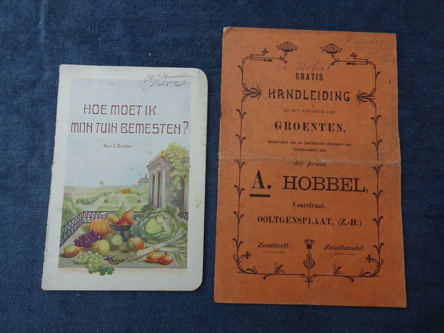 | Meer info: | Hoe moet ik mijn tuin bemesten met naam op het voorplat. Rug aan onderzijde ingescheurd. Eén pagina met enkele vlekjes. Boekje A. Hobbel met vouw door het midden en scheurtje op diezelfde vouw. Naam op voor- en achterplat, met potlood. |
