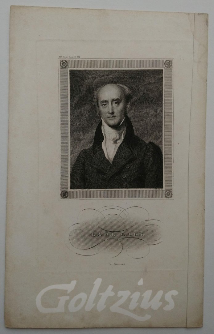 Earl Grey Portrait of Charles Grey, 2nd Earl Grey (1764-1845), known as Viscount Howick between 1806 and 1807, was a British politician who served as Prime Minister of the United Kingdom from 1830 to 1834. He was a descendant of the House of Grey and the namesake of Earl Grey tea. Steel engraving on wove paper, sheet size 242 x 152 mm., platemark 176 x 115 mm. Engraved by Johann Georg Nordheim after Sir Thomas Lawrence. Published by Carl Mayer in Nurnberg, in: Meyer, Joseph. Conversations-Lexikon für die gebildeten Stände, published between 1840-1855. Johann Georg Nordheim (Gehaus 1804-1854 Hildburghausen) was a German reproductive engraver and steel engraver, who engraved numerous portraits. Sir Thomas Lawrence (Bristol 1769-1830 London) was an English painter in pastels, watercolours and gouache, print collector and court painter. In good condition. A faint dampstain in the right margin edge. Some faint foxing and soiling in the margin edges, image area clean.
