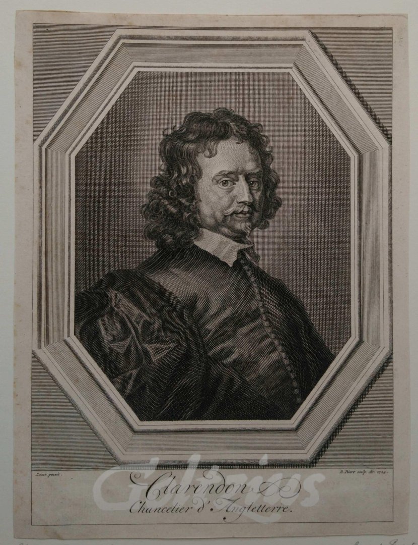 Clarendon Chancelier d'Angleterre Oval portrait of Edward Hyde, first count of Clarendon and chancellor of England. Engraving on laid paper, sheet size 210 x 159 mm. Engraved by Bernard Picart after Gerard Soest, published in Amsterdam 1724. This print was used in a publication: Burnet, Gilbert. Histoire des dernières révolutions d'Angleterre. The Hague: Jean Neaulme, 1725. Bernard Picart (Paris 1673-1733 Amsterdam) was a famous French draughtsman, engraver, and book illustrator active in Amsterdam. Gerard Soest (Soest 1605-1681 London) was a Dutch-born English painter. From 1645 he is active in London. He made mainly portraits in oil paint. John Riley and William Reader were students of Soest. In good condition, attached to carrier sheet by all four corners. Margins cropped to the platemark. Some faint general soiling in the edges. The image itself fine. References: LeBlanc vol. 3, p. 194: 549.