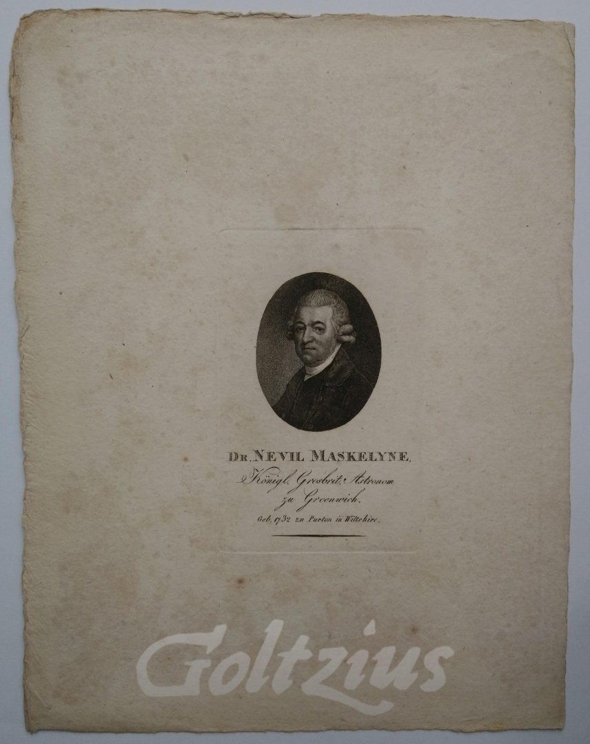 Dr. Nevil Maskelyne, Königl. Grosbrit. Astronom zu Greenwich Oval portrait of Nevil Maskelyne (1732-1811), the fifth British Astronomer Royal. He held the office from 1765 to 1811, and was the first person to scientifically measure the mass of Earth. Stipple and line engraving on wove paper, sheet size 307 x 237 mm., platemark 140 x 89 mm. Engraved by Konrad Westermayr, c. 1775-1834. Konrad Westermayr (Hanau 1765-1834) was a German engraver, painter, art teacher and academy director. In good condition, faint foxing in the margins and edges of the image area.