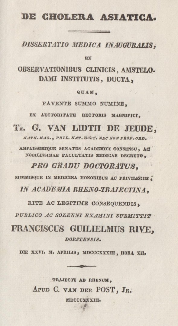 | Meer info: | Doctoral dissertation of Franz Wilhelm Rive (1804-1873). He studied medicine in Bonn and worked as physician in Utrecht between 1831 and 1833. In 1832 he was called to Amsterdam to help fight the cholera epidemic. |
