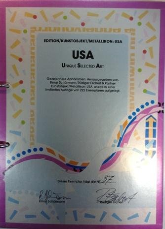 | Titel: | Edition / Kunstobjekt / Metallikon:: USA. Unique selected Art. Gezeichnete Aphorismen. FINE COPY. |