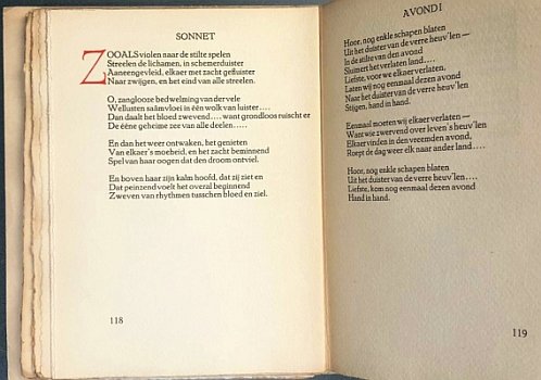 Amsterdam, Van Looy, 1914. Losse katernen in omslag. 144 (= 86, zie verderop) p. Omslag, typografie en prachtige initialen van Jan van Krimpen. Onafgesneden. Gezet uit de Hollandsche Mediæval van S.H. de Roos. 1e druk. Incompleet exemplaar: enkele katernen (pagina 9-56) ontbreken. Maar het lange gedicht van De Haan, 'Tot de volken' prijkt prachtig op p. 68-75. Eén van de 15 Romeins genummerde luxe-exemplaren, gedrukt op Haesbeek-Hollandsch van G.H. Bührmann. Dit is nummer ii, op naam gedrukt voor C. Mensink. Deze bekende almanak - met werk van o.a. Bloem, De Haan, Van der Leeuw, Van Nijlen en Roland Holst - in zijn meest begeerlijke uitvoering en tevens het eerste boek volledig ontworpen door Jan van Krimpen, maar incompleet. Een poor man's luxe Van Krimpen. == Nr. 2 of 15 deluxe copies, but 58 pages are missing. 'Tot de volken' is een gedicht geschreven onder het lijden van de Wereldoorlog: 'Laat ons Land los: Rusland, ruw land, wat zijt gij?'. Ook het werk van de andere dichters is de moeite van het lezen waard: Aart van der Leeuw, Dante in vertaling van Nico van Suchtelen, François Pauwels zelfs.