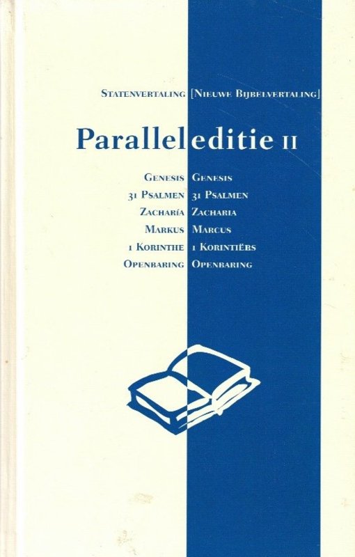 Paralleleditie II Statenvertaling en Nieuwe Bijbelvertaling, twee vertalingen naast elkaar, een uitgave van uitgeverij Jongbloed te Heerenveen. In dit deel staan de volgende bijbelboeken: - Genesis - 31 Psalmen - Zacharia - Markus - 1 Korinthe - Openbaring |