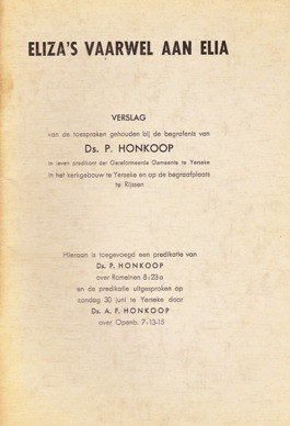 Eliza's vaarwel aan Elia is het verslag van de begrafenis van ds. P. Honkoop, in leven predikant der Gereformeerde Gemeente te Yerseke in het kerkgebouw te Yerseke en op de begraafplaats te Rijssen.