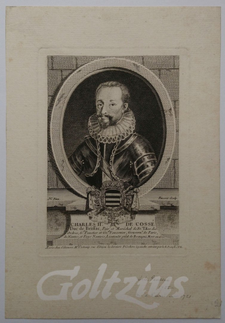 Charles II. de Cossé Oval bust-length portrait of Charles II de Cossé, in armor and with ruffled collar. Charles II de Cossé, 1st Duke of Brissac (c. 1550 -c. 1621) was a French noble, military commander, governor, courtier and rebel during the latter French Wars of Religion. Etching and engraving on hand laid paper, sheet size 228 x 158 mm., platemark 153 x 111 mm. Engraved by Sébastien Pinssio after Monogrammist N, and published in: Dreux du Radier, Jean-François. L'Europe illustré, contenant l'histoire abregée des souverains, des princes, des prélats, des ministres, (...) en Europe: dans le XVe. siècle compris, jusqu'à présent. Paris: Michel Odieuvre en André-François Le Breton, 1755-1765. Sébastien Pinssio (born 1721-active 1755) was an engraver in the employ of Odieuvre. In very good condition, margins faintly foxed overall. Image area quite fresh.