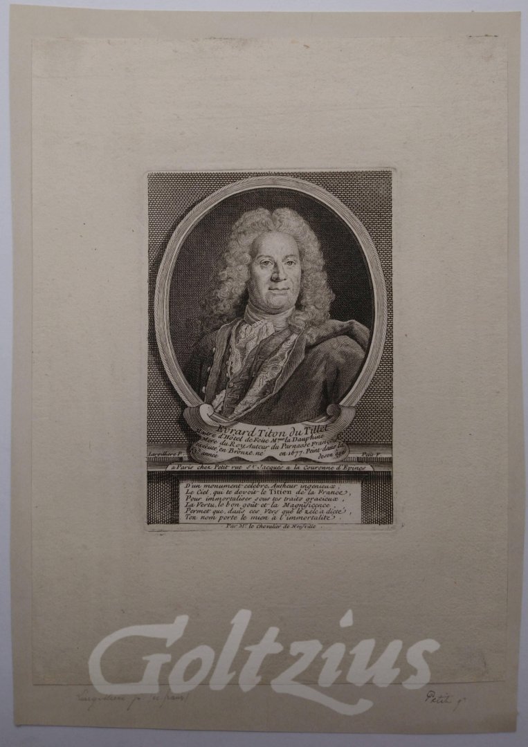 Evrard Titon du Tillet Oval bust-length portrait of Évrard Titon du Tillet (1677-1762). He is best known for his important biographical chronicle: 'Le Parnasse françois', composed of brief anecdotal life descriptions of famous French poets and musicians of his time. Engraving on hand laid paper, sheet size 263 x 193 mm., platemark 148 x 105 mm. Engraved by Gilles Edme Petit after Nicolas de Largillière, and published by Petit, 1750. Gilles Edme Petit (c. 1694-1760) was a French engraver and publisher, specialising in portraits and reproductions after Lancret and Boucher. HE was the brother-in-law of François Chéreau. Nicolas de Largillière (1656-1746) was a major French portrait painter. In excellent condition, ample margins, attached to carrier by all founr corners.