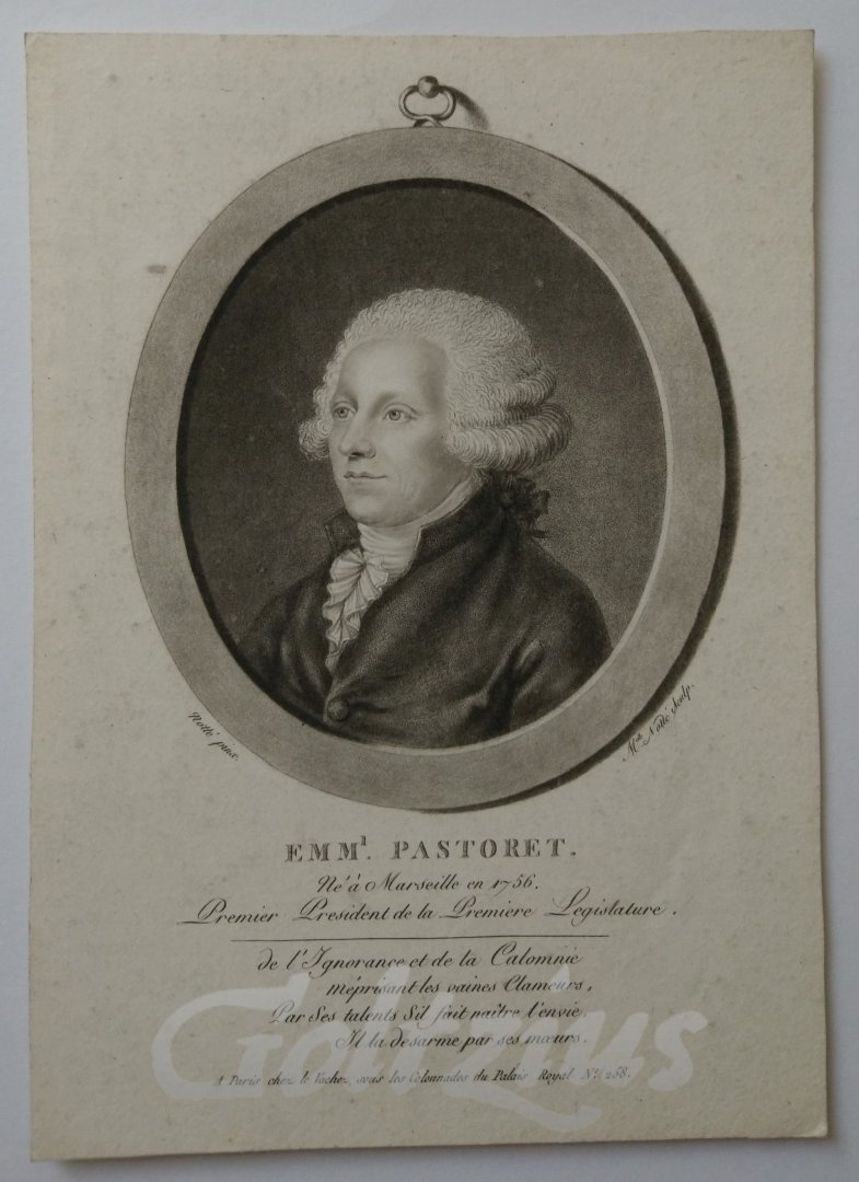 Emml. Pastoret Oval medallion portrait of Claude-Emmanuel Joseph Pierre, Marquess of Pastoret (Marseille 1755-1840 Paris), a French lawyer, author and politician. Aquatint on hand laid paper, sheet size 230 x 163 mm. Engraved by Mademoiselle Noté after Notté, published by Nicolas-François Le Vachez around 1790. We have not been able to establish any further information on 'Mademoiselle Noté'. Claude Jacques Notté (Nanteuil-sur-Marne 1753-1837) was a French miniature portrait painter. In very good condition, cropped within platemark. Some scattered faint soiling in the margins. A few small faint spots in the image area.