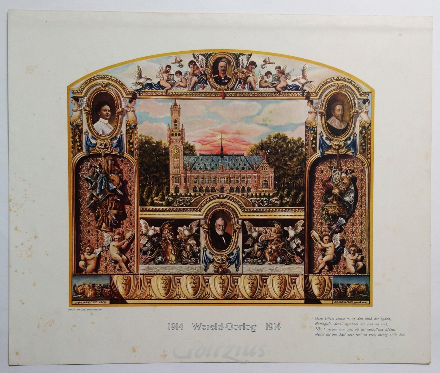 1914 Wereld-Oorlog 1914 Print commiserating the beginning of the First World War. It shows the Vredespaleis (Peace Palace) in The Hague (architect Prof. J.A.G. van der Steur), above a portrait of Andrew Carnegie (who donated money for the building). To the left a portrait of Queen Wilhelmina, to the right a portrait of William the Silent. In the top putti with Red Cross armbands sit around bandage chests, to the left and right of a portrait of an unidentified military man. Chromolithograph on wove paper, sheet size 390 x 470 mm. Designed and drawn by D.L. Kohlman, and printed by Geuze (Dordrecht). With a four-line poem in the lower left. In very good condition. Some scattered foxing (mostly in the margins, a few spots in the sky of the image area). A strip of cloth is pasted to the top margin verso, for previous attachment to carrier. An ink stamp indicates this print was once part of the print collection of the municipality of Vlaardingen (not in Lugt).