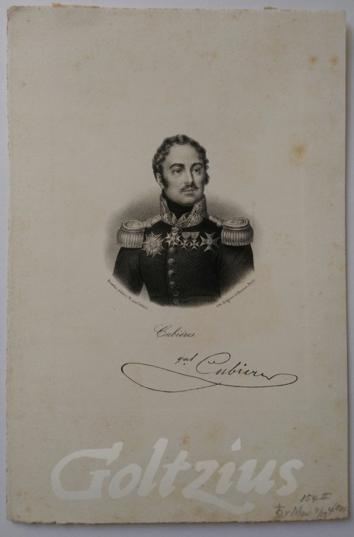 Cubières Bust-length portrait of General Amédée Louis de Cubières (Paris 1786-1853 Paris), a French general and politician. With facsimile of his signature below the image. Lithograph on wove paper, sheet size 272 x 182 mm., image size c. 145 x 115 mm. Lithographed and printed by Grégoire et Deneux, and published by V. Rosselin (Paris), c. 1844. Grégoire et Deneux was a 19th century Parisian lithographic printing company. In good condition, faint foxing throughout, although markedly less in the image area.