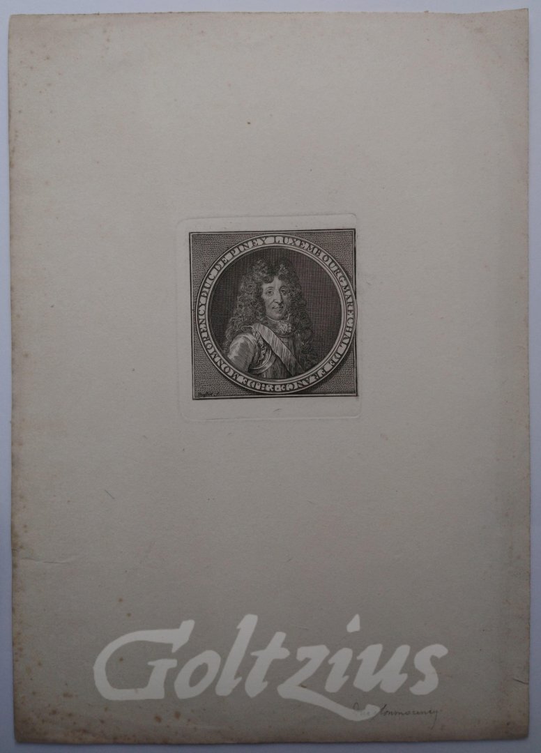 F.H. de Monmorency Duc de Piney Luxembourg Marechal de France Circular bust-elgnth portrait of François Henri de Montmorency-Bouteville, Duke of Piney-Luxembourg (1628-1695), nicknamed "The Upholsterer of Notre-Dame". He was a French general and Marshal of France. A comrade and successor of Louis, Grand Condé, he was one of the most accomplished military commanders of the early modern period and is particularly noted for his exploits in the Franco-Dutch War and War of the Grand Alliance. Engraving and stipple on wove paper, sheet size 313 x 220 mm., platemark 89 x 79 mm. Engraved by Claude-Augustin Duflos, and published c. 1750. Claude-Augustin Duflos (Paris 1700-1786) was a French engraved and reproductive artist. He was a student of Bernard Picart, and made numerous engravings for publications reproducing famous artworks. In very good condition, with ample margins. The margin edges a little foxed and faintly soiled.