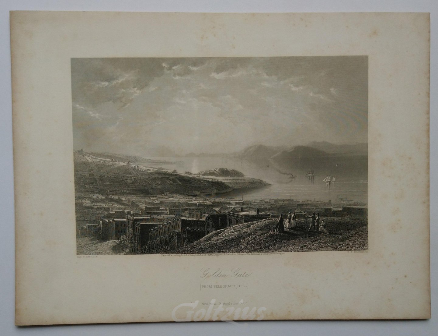 Golden Gate (from Telegraph Hill) Landscape engraving of Golden Gate (California), looking west with Russian Hill at the left and Marin peninsula at the right. Figures in the foreground; buildings, primarily residential, stretch out below them. Several ships in bay. Steel engraving on wove paper, sheet size 237 x 321 mm. Engraved by Edward Paxman Brandard after James David Smillie. Published in 1873 by D. Appleton & Co., New York. Edward Paxman Brandard (1819-1898) was a British painter of architectural monuments, engraver, etcher, steel engraver and illustrator. He was a brother of Robert and John Brandard. James David Smillie (1833-1909) was an American artist, cofounder of the American Watercolor Society and New York Etching Club. His brother was painter George Henry Smillie. In good condition, some general scattered soiling and foxing in the margin edges.