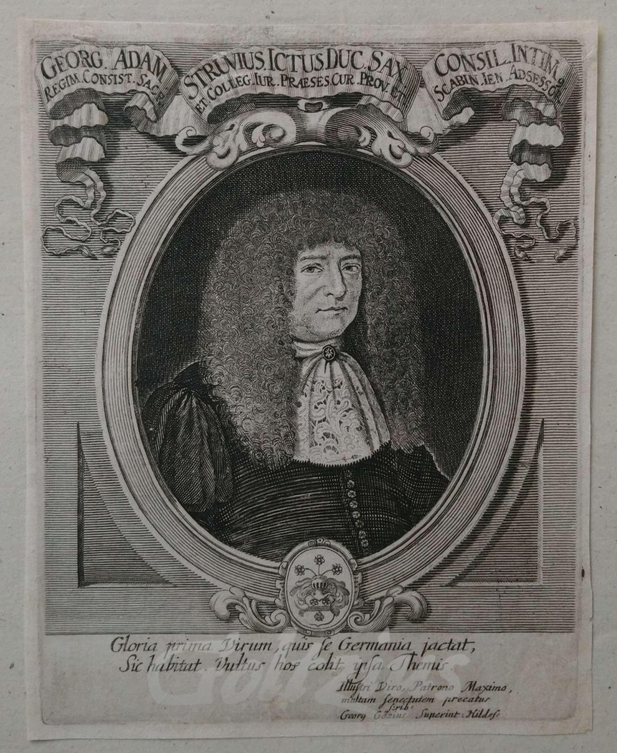 Georg Adam Struvius Bust-length portrait of Georg Adam Struve (1619-1692) was a German legal scholar, university professor of Jurisprudence and prolific author of legal texts. Etching and engraving on hand laid paper, on laid paper carrier. Sheet size 185 x 146 mm., platemark 172 x 140 mm., carrier size 365 x 240 mm. By an anonymous engraver, c. 1650-1700. In very good condition. Small margins, but a fine impression. References: Mortzfeld ('Die Porträtsammlung der Herzog August Bibliothek Wolfenbüttel'): A 21372.