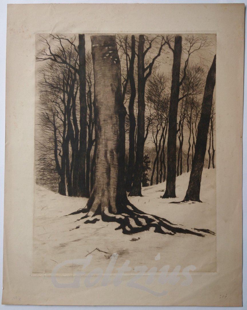 Forest in winter Several large trees in a winter landscape. Etching and drypoint with plate tone on laid paper (Van Gelder Zonen watermark). Sheet size 573 x 458 mm., platemark 467 x 359 mm. Anonymous etching, made c. first quarter 20th century. In good condition, some discolouration and foxing in the margins. Small creases in the top and bottom left around the platemark.