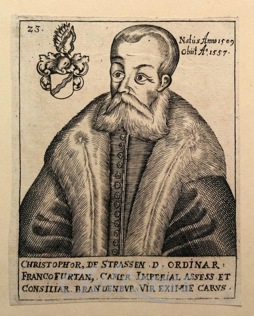 Christophor, de Strassen Half-length portrait of Christoph von der Strassen, looking to the left, wearing a fur-trimmed coat. Christoph von der Strassen (c. 1510-1560) was a German statesman, lawyer and professor of law. Engraving on hand laid paper, sheet size 130 x 105 mm., carrier size 364 x 226 mm. Anonymous book illustration, published in: Küster, Georg Gottfried. Martin Friedrich Seidels Bilder-Sammlung in welcher hundert, gröstentheils in der Mark Brandenburg. Berlin: Buchladen bey der Real-Schule, 1751. In excellent condition, but cropped within platemark and attached to carrier sheet.