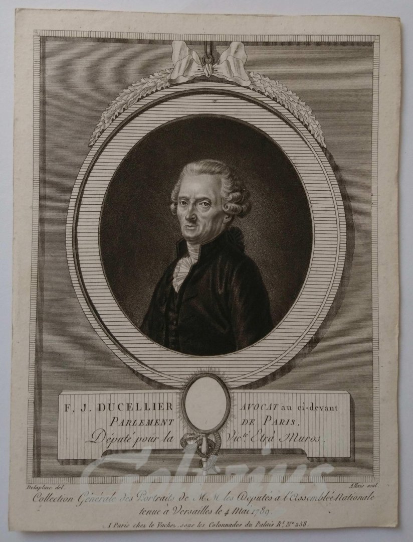 F.J. Ducellier Oval portrait of François Jacques Ducellier (1726-1801), a French politician, deputy and member of the National Assembly. Aquatint portrait in etched decorative border, on hand laid paper, sheet size 232 x 174 mm. Engraved by Louis Jean Allais after Jacques Delaplace, published in the series 'Collection générale des Portraits de MM. les Députés à l'Assemblée Nationale Constituante, tenue à Versailles le 4. Mai 1789'. This series was published by Nicolas-François Le Vachez in 1789. Louis Jean Allais (1762-1833) was a French engraver and printmaker in aquatint. Jacques Delaplace (Vernon 1767-after 1831) was a French (court) painter and miniature portrait painter. In very good condition, cropped within platemark. Some faint soiling in the margin edges. A small spot in the border around the portrait.