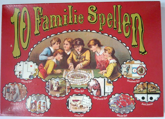 Bijzonderheden: Doos met 10 op stevig karton gedrukte spellen uit grootmoeders tijd. Het betreft een facsimile-uitgave door Lever´s Zeep-Maatschappij bv, Schiedam uit 1974. De doos bevat 4 kaartjespellen: waarzegspel, loterijspel, rijm quartetspel en beeld domin...
