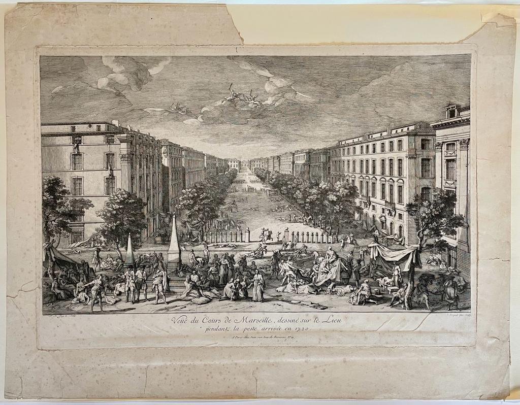 | Bijzonderheden: | View of Marseille during the plague, with people dying in the foreground; in the background, wide street lined with buildings.Titled and dated below: Veue du Course de Marseille, dessiné sur le Lieu pendant la peste arrivée em 1720.With the addr... |