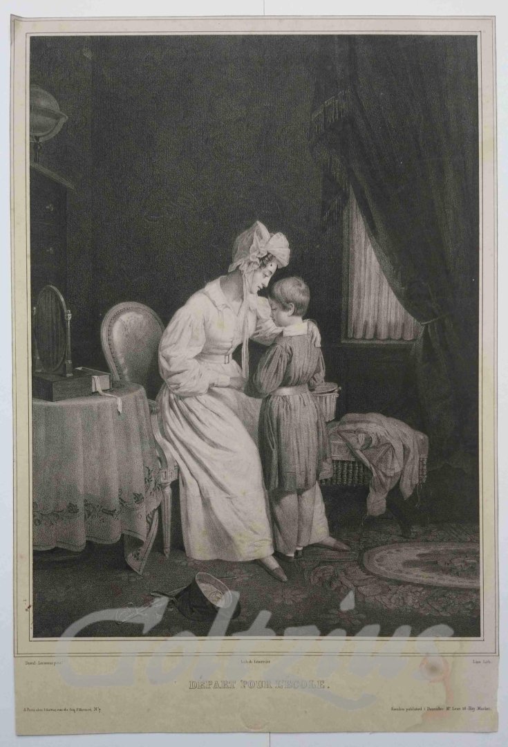 Départ pour l'école "Departure for college". A young boy is embraced by his mother, while in her bedroom. The scattered objects on the floor (cap and sabre) as well as the boy's dress suggest he is going off to military school. Lithograph on wove paper, sheet size 381 x 259 mm., image size 320 x 237 mm. Lithograph after own design by Pierre Duval le Camus, printed by Lion and published by Lemercier in Paris and McLean in London, c. 1830. Pierre Duval le Camus (Lisieux 1790 - 1854 Saint-Cloud) was a French painter and lithographer who specialised in portraits and genre scenes. His father was a master glazier and sent him to Paris to learn the trade. However, Pierre found himself attracted to the arts instead was taught by Claude Gautherot. From 1808 he would study with Jacques-Louis David. In very good condition. Sheet cropped to the image border. A small crease in the top left margin corner. A few small spots in the lower left margin, and a dampstain in the lower right margin corner (this lightly affecting the corner of the image).