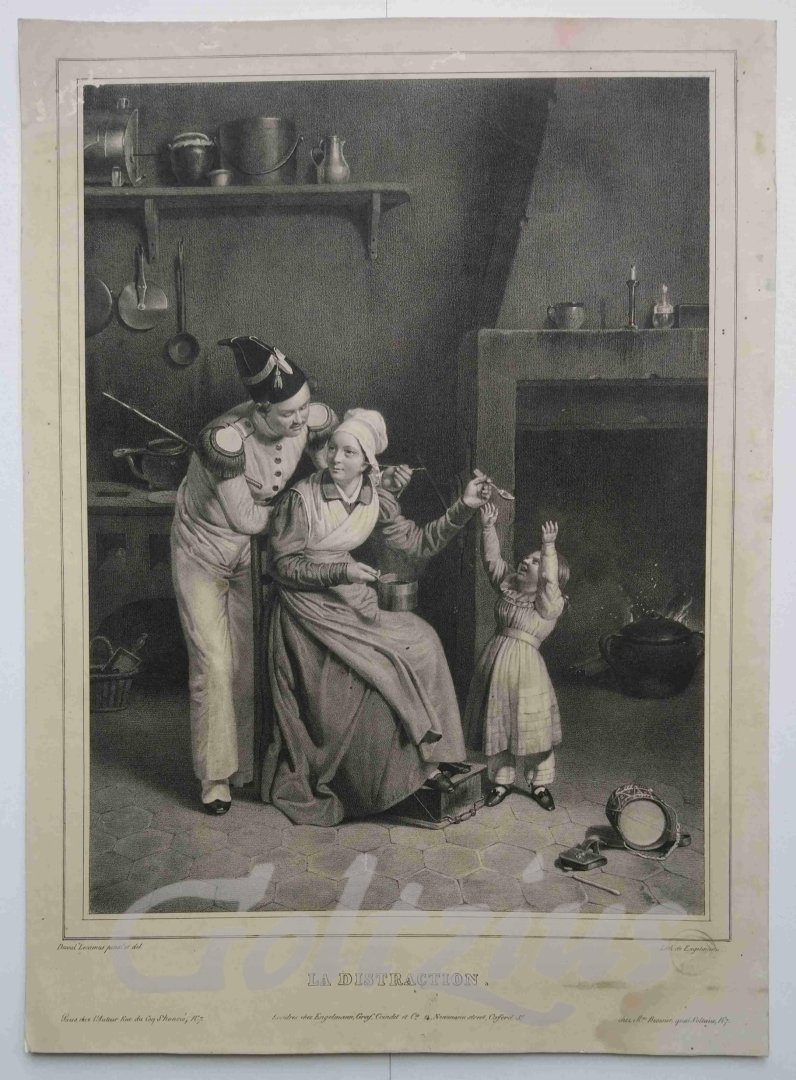 La distraction "The Distraction". A soldier stands behind his seated wife in the kitchen. A child stands with outstreched hands towards the spoon that the woman holds up, but she is distracted by the attentions of her man. Lithograph on wove paper, sheet size 395 x 287 mm., image size 319 x 239 mm. Lithograph after own design by Pierre Duval le Camus, printed and published by Engelmann in London, c. 1830. The print was sold in London by Engelmann, Graf, Coindet, et cie., and in Paris by the artist and Mme. Brossier. Pierre Duval le Camus (Lisieux 1790 - 1854 Saint-Cloud) was a French painter and lithographer who specialised in portraits and genre scenes. His father was a master glazier and sent him to Paris to learn the trade. However, Pierre found himself attracted to the arts instead was taught by Claude Gautherot. From 1808 he would study with Jacques-Louis David. In good condition. Surface damage in the top margin and extreme top left corner of the image (insect damage). A few small spots in the center of the image area, a few more in the right margin. A faint dampstain in the lower right margin corner. All in all a good impression.