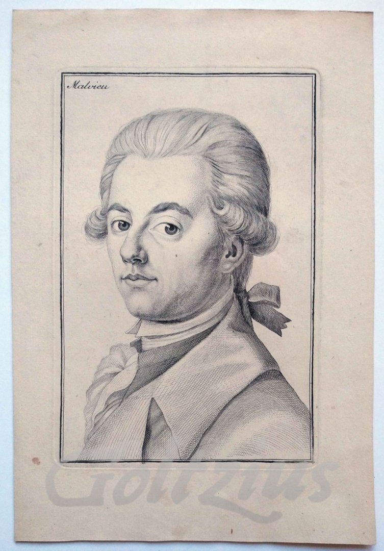 Malvieu Portrait of French engraver Paul Malvieux. Engraving with stipplework on hand laid paper, sheet size 307 x 207 mm., platemark 232 x 153 mm. Engraved by Paul Malvieux, after his own design, c. 1780. This print was also published in various editions of Lavater's 'Essays on Physiognomy'. Paul Malvieux (1763-1791) was a German printmaker and artist. In very good condition. Minimal discolouration in the top margin. A few scattered tiny stains in the margins.