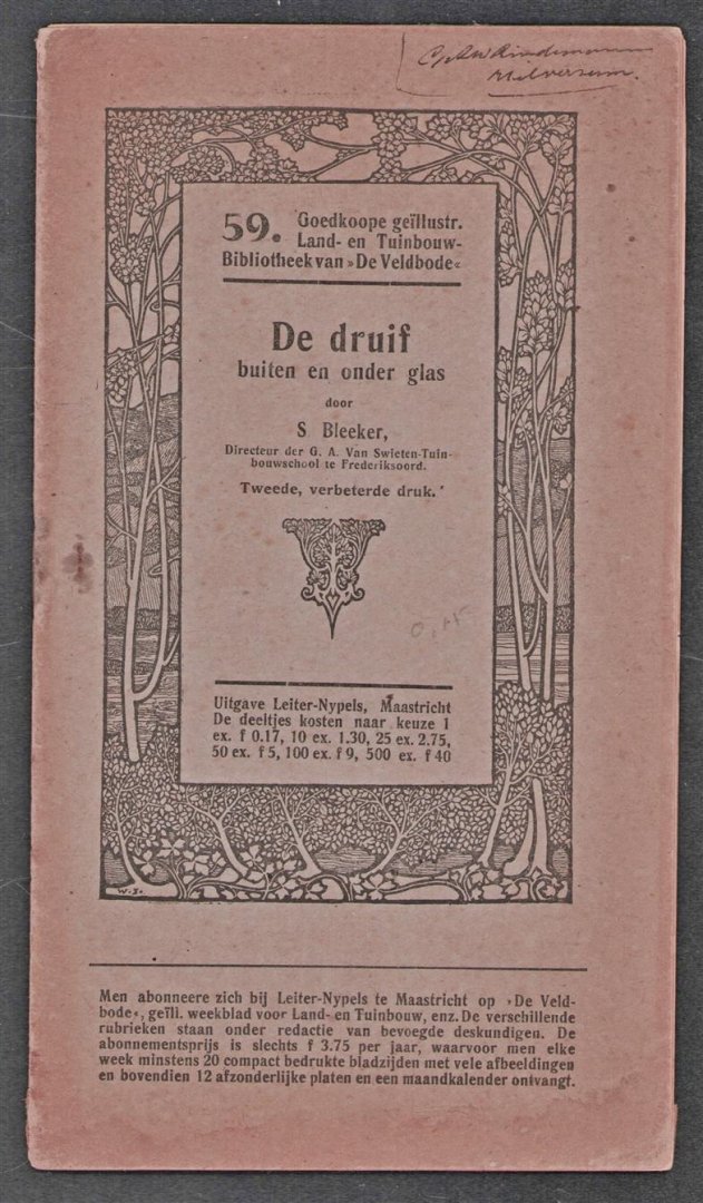 | Bijzonderheden: | 1907, Zeer goed, 29 p. : ill. ;11,4x21,6 Cm. = Nr 59 Goedkoope geillustreerde land en tuinbouw bibliotheek van de veldbode. - Leuke illustraties over bv het snoeien |