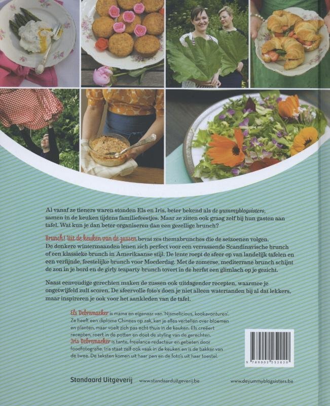 Al sinds ze tieners waren stonden Els en Iris, beter bekend als the yummy blogsisters, samen in de keuken tijdens familiefeestjes. Vanuit hun liefde voor eten ontstond hun kookblog. De zussen staan graag in de keuken, maar zitten ook graag zelf bij de gasten. Wat kun je dan beter organiseren dan een gezellige brunch? En als de gasten zo enthousiast zijn en het zelf willen proberen, dan kun je je ideen en recepten het best neerschrijven en fotograferen voor een boek: Brunch!Omdat je op elk tijdstip van het jaar een brunch kunt organiseren, bevat Brunch! zes themabrunches die de seizoenen volgen. De donkere wintermaanden lenen zich perfect voor een verrassende Scandinavische brunch of een klassieke brunch in Amerikaanse stijl. De lente roept de sfeer op van landelijk tafelen en een verfijnde, feestelijke brunch voor moederdag waarbij de kindjes kunnen helpen. De mediterrane brunch tovert dan weer de zon op je bord en de girly Britse 'teaparty met een beetje meer' een glimlach op je gezicht.Bij de Scandinavische brunch is er aquavit als heerlijke schnaps, maar ook als smaakmaker in een verrassende Rodebietjessla. Maar ook Geroosterde pastinaak-wortelsoep met steranijs en natuurlijk de Gravad lax en de Kottbullar met veenbessensaus staan op tafel. Voor de kindjes is er zelfgemaakte limonade. Want ook de kleinsten worden niet vergeten door de zussen. En kinderen vinden zo'n buffet natuurlijk het einde. Ze kunnen immers zelf kiezen wat ze willen eten en hoeven niet de hele tijd aan tafel te blijven zitten.Naast eenvoudige gerechten maken de zussen ook wat meer uitdagende recepten waarmee je ongetwijfeld hoge ogen zult gooien. De sfeervolle foto's doen je niet alleen doen watertanden bij al dat lekkers, maar willen je ook inspireren voor het aankleden van de tafel. Els heeft immers jarenlang een bloemenwinkel gehad en geeft je graag enkele insidertips.Els Debremaeker is mama en eigenaar van 'Njamelicious, kookavonturen'. Ze heeft een diploma Chinees op zak, kan je alles vertellen over bloemen en planten maar voelt zich pas echt thuis in de keuken. Els creëert recepten, roert in de potten en doet de styling van de gerechten. Kom meer over haar te weten op haar site www.njamelicious.be.Iris Debremaeker is tante, freelance redacteur en gebeten door foodfotografie. Iris staat zelf ook vaak in de keuken en is de bakker van de twee. De teksten komen uit haar pen, de foto's uit haar toestel en de inspiratie uit de servieskast van Els.Meer informatie vind je op de website van de yummyblogsisters.