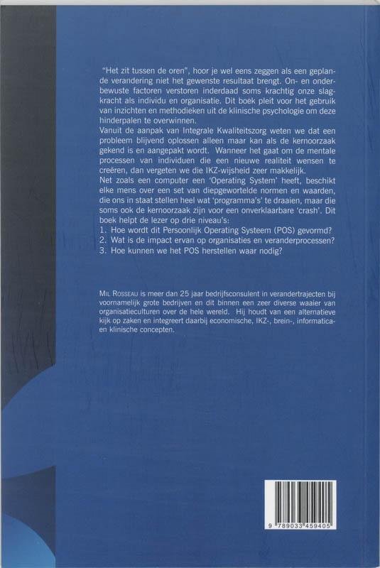 Het zit tussen de oren hoor je wel eens zeggen als een geplande verandering niet het gewenste resultaat brengt. Onbewuste en onderbewuste factoren verstoren inderdaad soms krachtig onze slagkracht als individu en organisatie. Dit boek pleit voor het gebruik van inzichten en methodieken uit de klinische psychologie om deze hinderpalen te overwinnen.Vanuit de aanpak van Integrale kwaliteitszorg (IKZ) weten we dat een probleem blijvend oplossen enkel kan als de kernoorzaak gekend en aangepakt wordt. Wanneer het gaat om de mentale processen van individuen die een nieuwe realiteit wensen te creëren, dan vergeten we die IKZ wijsheid zeer gemakkelijk.Net zoals een computer een operating system heeft, beschikt elk mens over een set van diepgewortelde normen en waarden die ons in staat stellen heel wat programmas te draaien, maar die ook soms de kernoorzaak zijn van een onverklaarbare crash. Dit boek helpt de lezer op drie niveaus: 1. Hoe wordt dit Personal Operating System (POS) gevormd?; 2. Wat is de impact ervan op organisaties en veranderprocessen?; 3. Hoe kunnen we het POS herstellen waar nodig?