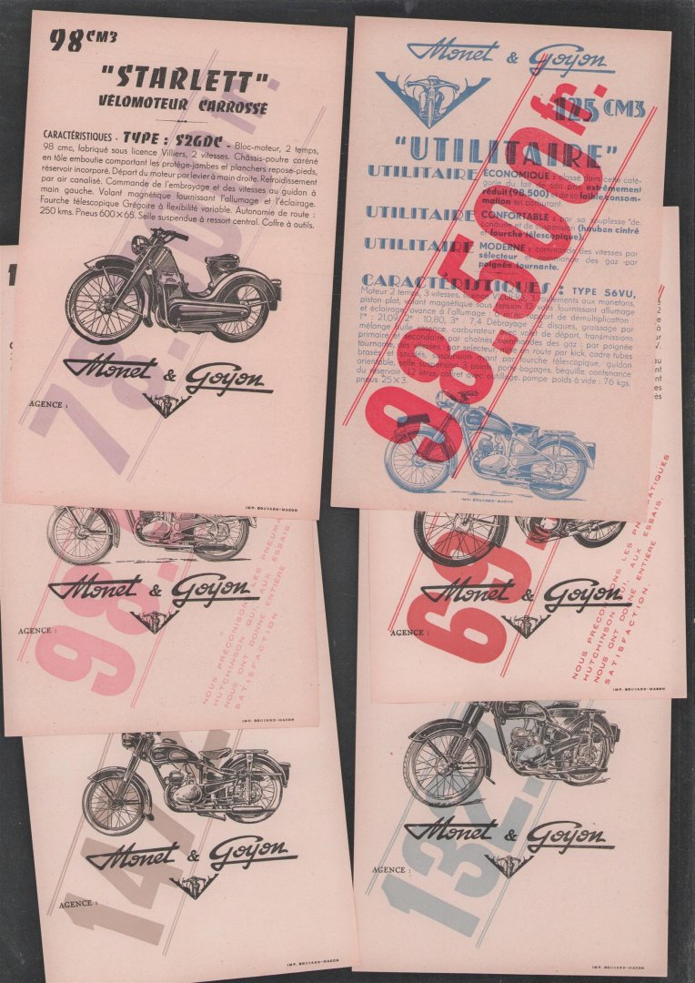 | Bijzonderheden: | c 1950?, Zeer goed, Elke folder 1 pag. 13,5x21 Cm. Monet-Goyon is een historisch Frans merk van motorfietsen, - Type S6VU 125 Cm3 + Grand Luxe S6VL - 125Cm3 + Utilaire Type S6VU 125Cm3 + Sport Luxe Type S6VG4 + 125Cm3 + Sport Luxe Type S6VG4 125 ... |