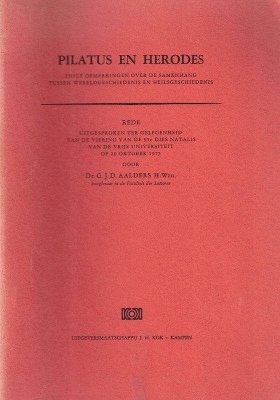 Pilatus en Herodes, enige opmerkingen over de samenhang tussen wereldgeschiedenis en heilsgeschiedenis door dr. G.J.D. Aalders H.Wzn., hoogleraar in de Faculteit der Letteren. Rede uitgesproken ter gelegenheid van de viering van de 95e Dies Natalis van de Vrije Universiteit op 20 oktober 1975. |
