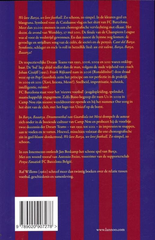 Twintig jaar virtuoos voetbal van de balkunstenaars van Barça Dreamteam FC Barcelona is al verschillende decennia hét paradepaardje van modern voetbal. Een boeiende terugblik op vier dreamteams met ronkende namen als Johan Cruijff, Ronald Koeman, Romario, Ronaldo, Rijkaard, Van Bronkhorst, Ronaldinho, Rivaldo, Puyol, Xavi, Iniesta en Messi. Barça is meer dan een club: ze staat ook over burgerzin, want ze geeft de ziel van Catalonië weer én is tegelijk universeel door haar steun aan Unicef. Barça is een wereldwijd fenomeen. Een uniek document over twintig jaar Barça en een blik achter de schermen bij deze topploeg.