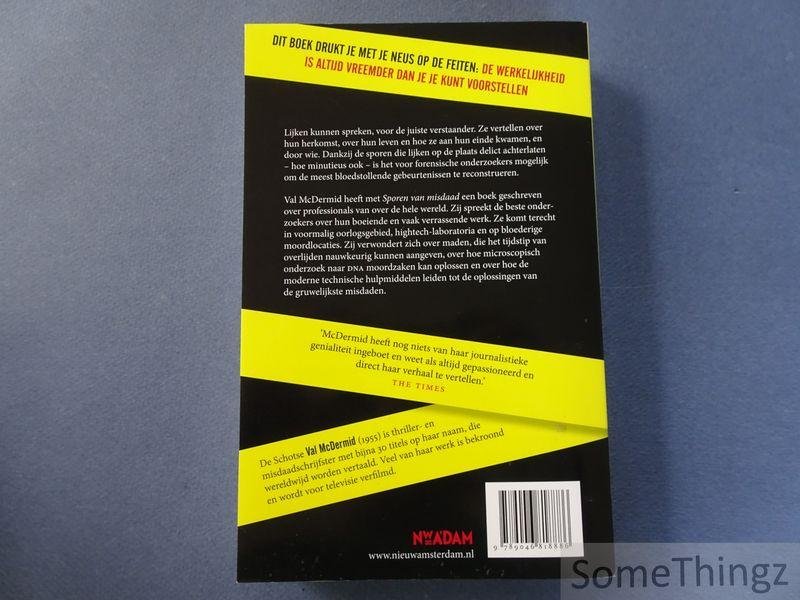 Lijken kunnen spreken, voor de juiste verstaander. Ze vertellen over hun herkomst, over hun leven en hoe ze aan hun einde kwamen, en door wie. Dankzij de sporen die lijken op de plaats delict achterlaten - hoe minutieus ook - is het voor forensische onderzoekers mogelijk om de meest bloedstollende gebeurtenissen te reconstrueren. Val McDermid heeft met Sporen van misdaad een boek geschreven over professionals van over de hele wereld. Zij spreekt de beste onderzoekers over hun boeiende en vaak verrassende werk. Ze komt terecht in voormalig oorlogsgebied, high tech laboratoria en op bloederige moordlocaties. Zij verwondert zich over maden, die het tijdstip van overlijden van lijken nauwkeurig kunnen aangeven, over hoe microscopisch onderzoek naar DNA moordzaken kan oplossen en over hoe de moderne technische hulpmiddelen leiden tot de oplossingen van de gruwelijkste misdaden. 'De verhalen die je in dit boek leest, van plaats delict tot de uiteindelijk gang naar de rechter, behoren tot de meest fascinerende die je ooit zult lezen. Het drukt je met de neus op de feiten: de waarheid is altijd vreemder dan je je kunt voorstellen.'