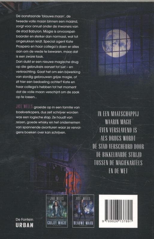 'The Wire' en 'Breaking Bad' met magie... In 'Blauwe maan', het tweede deel in de Kate Prospero-serie van Jaye Wells en het vervolg op 'Grijze magie', lopen de spanningen in Babylon hoog op... De aanstaande blauwe maan, de tweede volle maan binnen een maand, zorgt voor onrust onder de inwoners van de stad Babylon, Ohio. Kate en haar collega's doen er alles aan om de vrede te bewaren, maar dat wordt moeilijk als er een nieuwe magische drug is opduikt die de gebruikers aanzet tot verkrachting en geweld. En hoe dichter bij de volle maan, hoe krachtiger de drug wordt. Ze hebben maar een paar dagen om de zaak op te lossen, voor er in de hele stad slachtoffers zullen vallen...