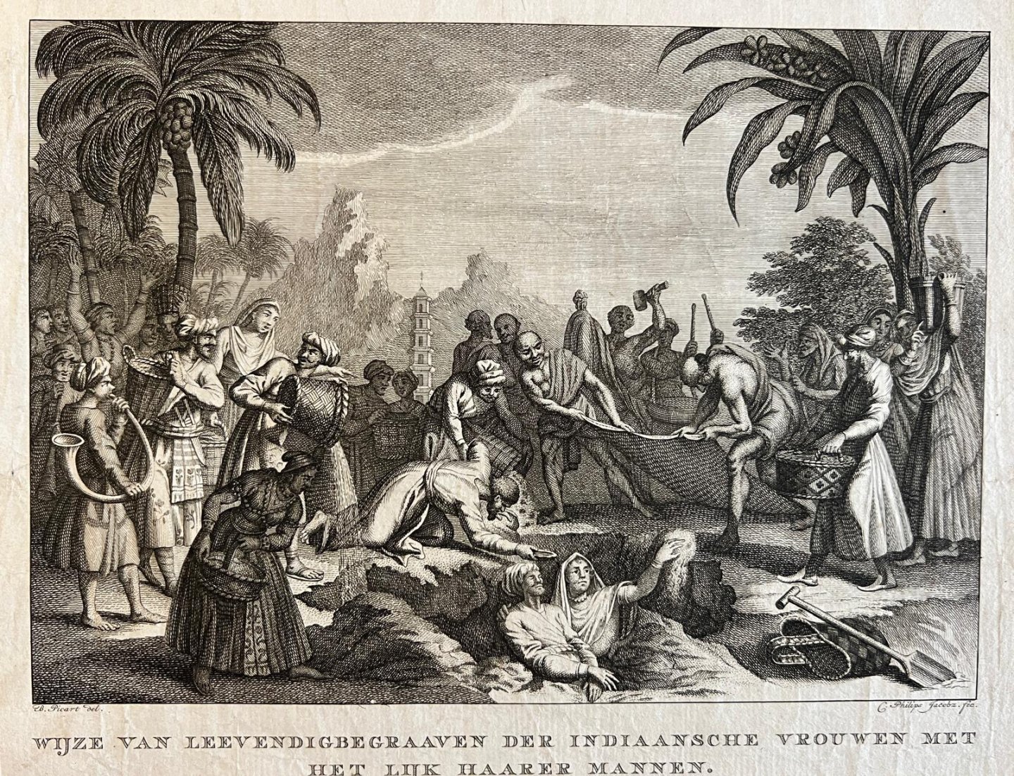 | Titel: | Antique print India ca 1785 | Wijze van leevendigbegraaven der Indiaansche vrouwen met het lijk haarer mannen, engraving made by Caspar Jacobsz. Philips, after Bernard Picart, 1 p. |