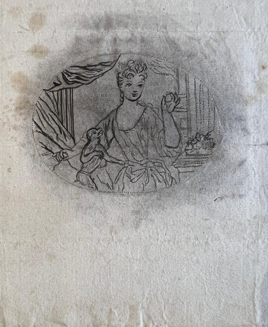 | Bijzonderheden: | Original drawing in an oval of a Lady in a nice dress in a bedroom? with a monkey on the left side.[NL] Originele tekening gemaakt met prikkunst, allemaal kleine gaatjes als basis voor de tekening, daarna is eroverheen getekend met potlood. |