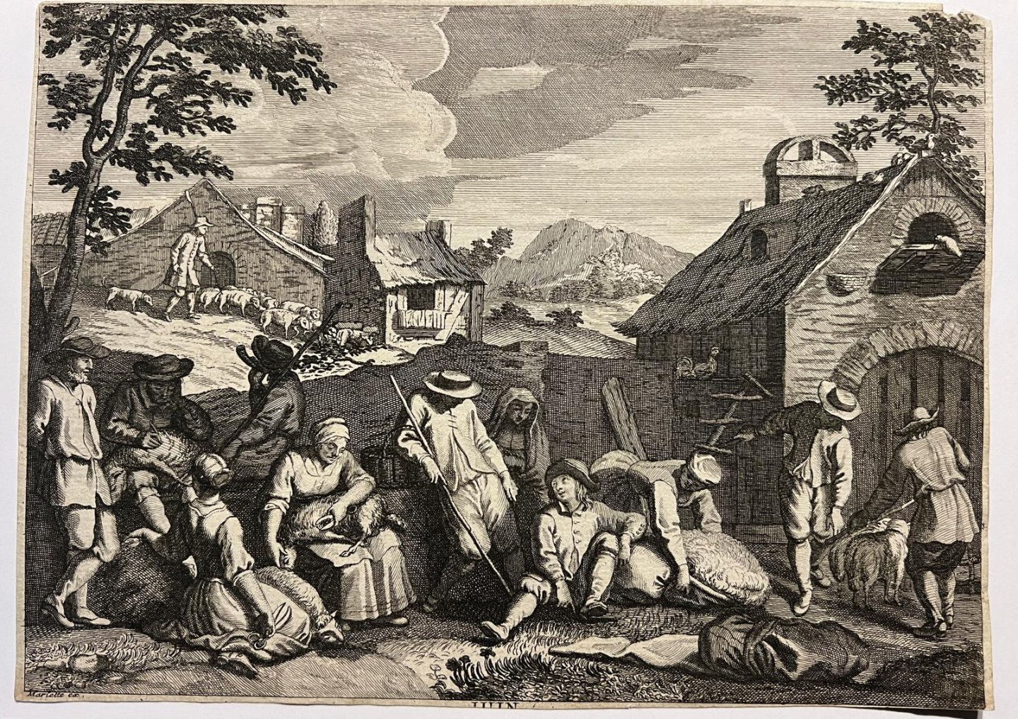 | Titel: | Genre print Calender month June I Print for the month June (from the series of 12 months) with sheep-shearing, in the bottom one sees JUIN, after Mariette, 1p. |