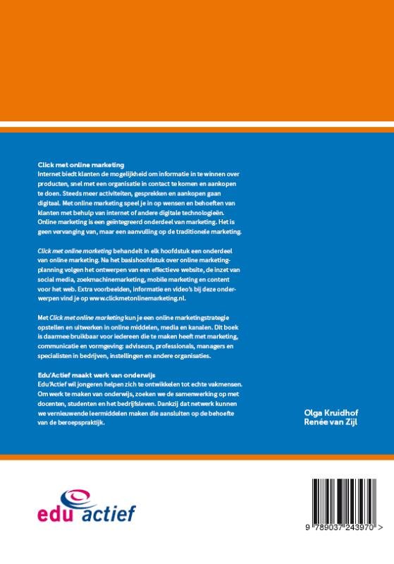 Internet biedt klanten de mogelijkheid om informatie in te winnen over producten, snel met een organisatie in contact te komen en aankopen te doen. Steeds meer activiteiten, gesprekken en aankopen gaan digitaal. Met online marketing speel je in op wensen en behoeften van klanten met behulp van internet of andere digitale technologieën. Online marketing is een geïntegreerd onderdeel van marketing. Het is geen vervanging van, maar een aanvulling op de traditionele marketing.Click met online marketing behandelt in elk hoofdstuk een onderdeel van online marketing. Na het basishoofdstuk over online marketingplanning volgen het ontwerpen van een effectieve website, de inzet van social media, zoekmachinemarketing, mobile marketing en content voor het web. Extra voorbeelden, informatie en video's bij deze onderwerpen vind je op www.clickmetonlinemarketing.nl. Met Click met online marketing kun je een online marketingstrategie opstellen en uitwerken in online middelen, media en kanalen. Dit boek is daarmee bruikbaar voor iedereen die te maken heeft met marketing, communicatie en vormgeving: adviseurs, professionals, managers en specialisten in bedrijven, instellingen en andere organisaties.