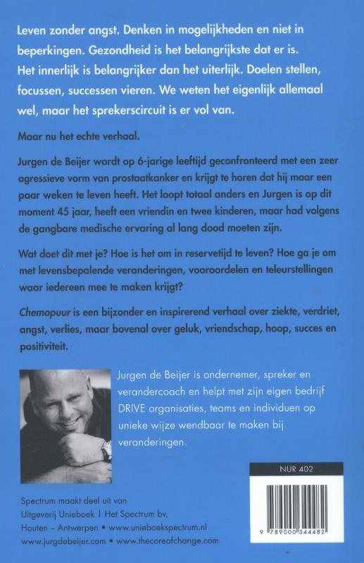 Wat doet dit met je? Hoe is het om in reservetijd te leven? Hoe ga je om met levensbepalende veranderingen, vooroordelen en teleurstellingen waar iedereen mee te maken krijgen? Chemopuur is een bijzonder en inspirerend verhaal over ziekte, verdriet, angst, verlies, maar bovenal over geluk, vriendschap, hoop, succes en positiviteit. Jurgen de Beijer is ondernemer, spreker en verandercoach. Hij helpt met zijn eigen bedrijf DRIVE organisaties, teams en individuen op unieke wijze wendbaar te maken bij veranderingen. |
