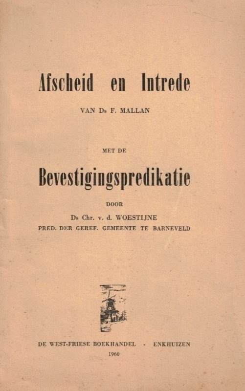 | Titel: | Mallan, Ds. F. en Woestijne, Ds. Chr. van de-Afscheid, intrede en bevestigingspredikatie |